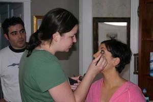 Make-up artist Jill Sanders touches Julie Tortorici up before the next shot