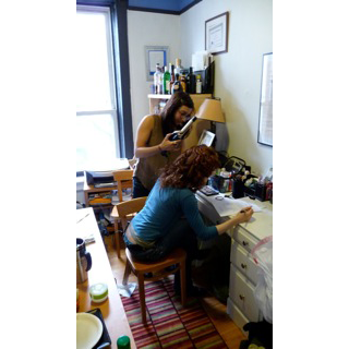 Becky looks over her script as Natalie readies the curling iron